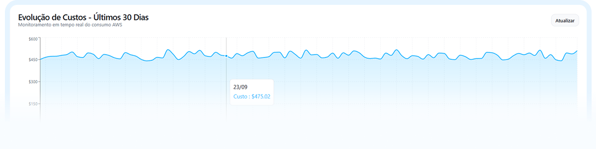 Análise profunda dos padrões de gastos na AWS, com detalhamento por serviço, região e recurso.