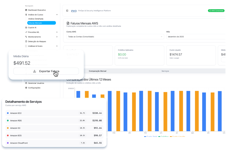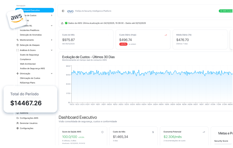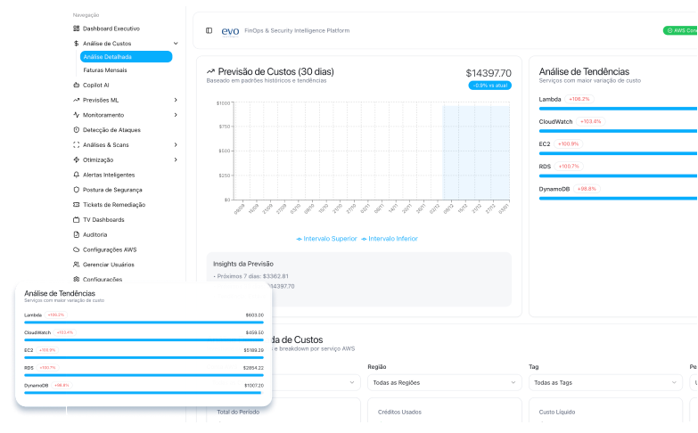 A EVO é uma plataforma de Cloud Intelligence para AWS que unifica gestão de custos (FinOps), segurança, compliance e performance em um único ambiente. Ela oferece monitoramento contínuo, proteção proativa e decisões orientadas por Inteligência Artificial, ajudando empresas a operar AWS com previsibilidade e segurança.