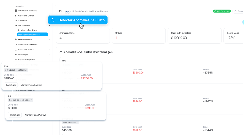 A EVO utiliza Machine Learning para previsão de custos, detecção de anomalias e identificação de desperdícios. Ela analisa o uso de recursos, sugere otimizações como Reserved Instances e Savings Plans, e antecipa aumentos de gastos antes que impactem a fatura.