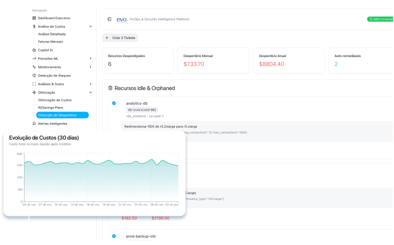A EVO analisa dados de billing, uso e performance para identificar desperdícios e otimizações de forma autônoma.