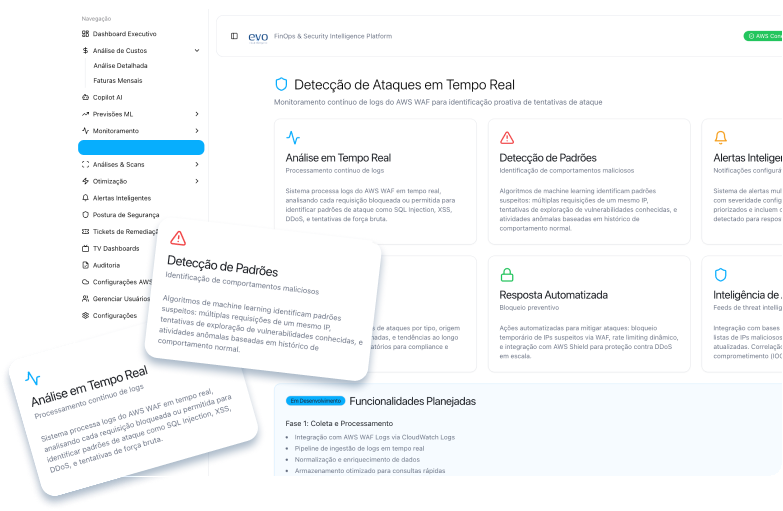 A EVO realiza monitoramento contínuo de segurança, identificando más configurações, comportamentos suspeitos e desvios de padrão. A plataforma também executa Well-Architected Reviews automatizados e acompanha compliance com frameworks como ISO 27001, SOC 2, PCI DSS e GDPR, evitando riscos e falhas silenciosas.